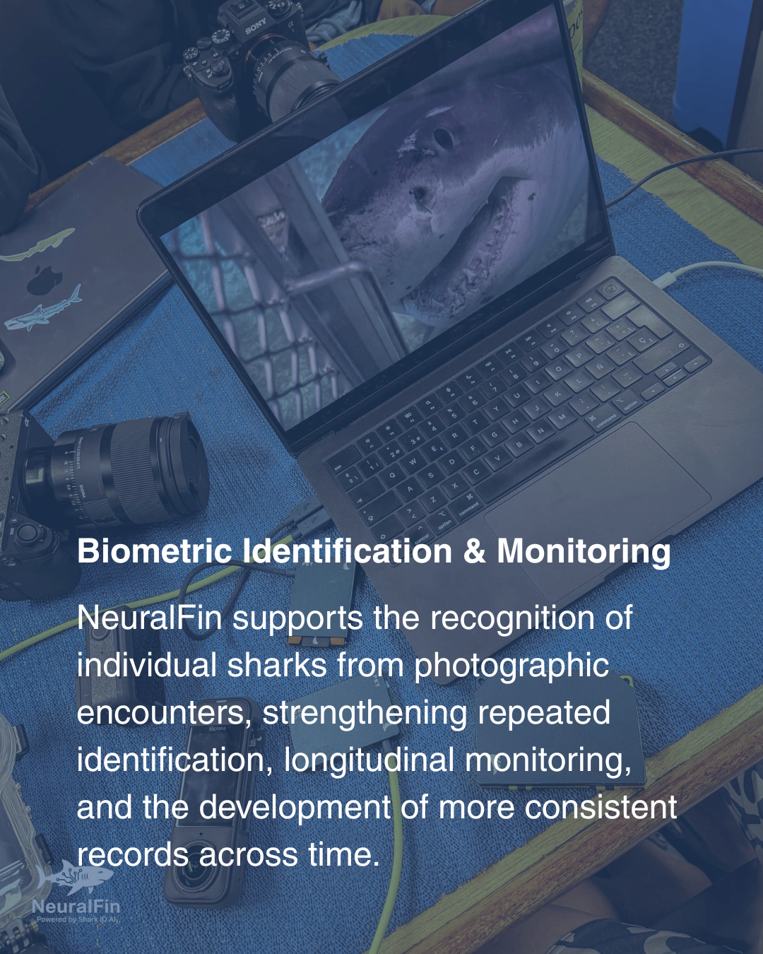 NeuralFin has developed an advanced biometric shark identification and monitoring capability designed to support individual-level recognition at scale and strengthen the scientific value of repeated photographic encounters. By applying image-based biometric analysis to stable visual characteristics, including fin morphology, natural markings, and body pattern structure, the system enables individual sharks to be recognised across time with a level of consistency, resolution, and analytical repeatability that is not achievable through isolated observations or manual comparison alone. This capability allows photographic encounters to be translated into structured longitudinal records that support catalogue continuity, repeated identification, encounter history reconstruction, and more robust monitoring of spatial and temporal patterns relevant to shark science, conservation assessment, and long-term marine research.